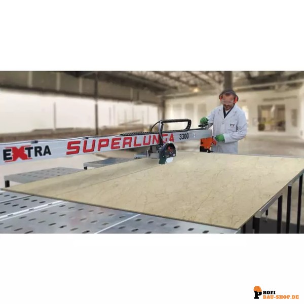 Die ELMAG Steintrennmaschine SUPERLUNGA EXTRA 3300S ist eine leistungsstarke Nassschneidmaschine für präzise und extralange Schnitte bis 3300 mm bei Fliesen und Naturstein, inklusive Diamantscheibe.