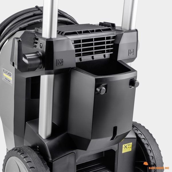 Im Inneren überzeugt der HD 10/25-4 S Plus mit hochwertigen Materialien: Eine robuste Taumelscheibenpumpe mit Edelstahlkolben und Zylinderkopf aus Messing wird von einem langsam laufenden, wasser- und luftgekühlten 4-poligen Motor angetrieben, der für höchste Zuverlässigkeit und Langlebigkeit bürgt. Das leichte und doch robuste Chassis aus Aluminium-Rahmenträgern bildet ein mobiles Design, das sogar die Kranverladung ermöglicht. Das kompakte Upright-Konzept mit vertikal verbauter Motor- und Pumpeneinheit sorgt für optimale Mobilität und Standfestigkeit. Praktische Aufbewahrungsmöglichkeiten wie eine Kängurutasche und verstellbare Haken runden das durchdachte Design ab und machen den HD 10/25-4 S Plus zum idealen Partner für effiziente und ermüdungsarme Reinigung.