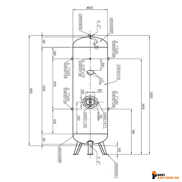 Technische Daten AEROTEC 500 l stehend - 16 bar verzinkt AD2000 Druckluftbehälter
