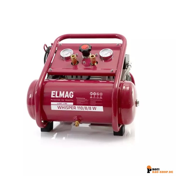 Der ELMAG WHISPER 110/8/8 W ist ein extrem leiser (56 dB(A)), ölfreier und tragbarer Flüsterkompressor, ideal für anspruchsvolle Heimwerker. Er ist serienmäßig mit Druckschalter, Druckregler und zwei Schnellkupplungen ausgestattet.
