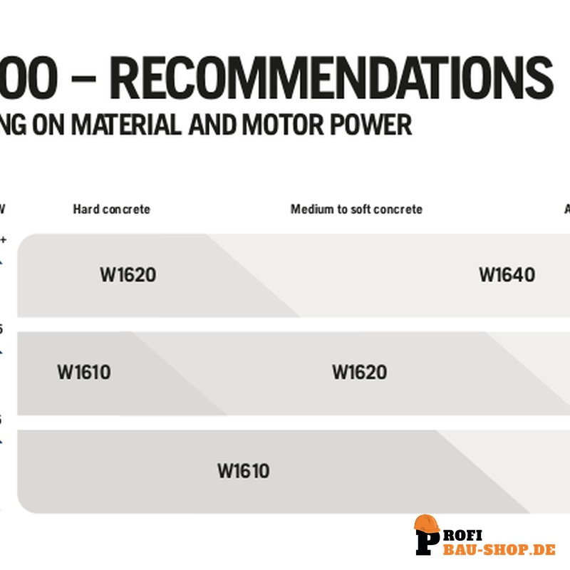 Die W1640 wurde für Hochleistungssägen mit einer Motorleistung von bis zu 25 kW entwickelt und ist optimal für verschiedene Anwendungsbereiche geeignet, wie harter, mittelharter, weicher und abrasiver Beton. Zudem eignet sie sich für Sägen mit mittelstarker Leistung, wie die WS 482 für abrasiven Beton und Beton mit Feuerstein als Zuschlagstoff. Sie bietet eine ausgezeichnete Leistung in stark armiertem Stahlbeton.