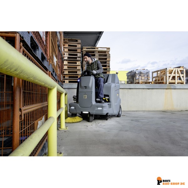 Die Kärcher Aufsitzkehrmaschine KM 100/120 R G überzeugt durch ihre hohe Vielseitigkeit und hervorragende Kehrergebnisse, sowohl in staubigen Außenbereichen als auch in gut belüfteten Innenbereichen. Speziell entwickelt, um unterschiedlichste Bodenbeschaffenheiten mühelos zu meistern, sorgt ihre pendelnd gelagerte Kehrwalze für eine konstante Reinigungsleistung. Mit einem großzügigen Kehrbehältervolumen von 120 Litern, einem einschwenkbaren Seitenbesen und einer Arbeitsgeschwindigkeit von 7 km/h ermöglicht die Maschine umfangreiche, zügige und sichere Kehreinsätze, während das bewährte Rundfiltersystem mit 6 m² Filterfläche und automatischer Abreinigung für kontinuierliches, nahezu staubfreies Kehren sorgt und die Gesundheit des Anwenders schützt.