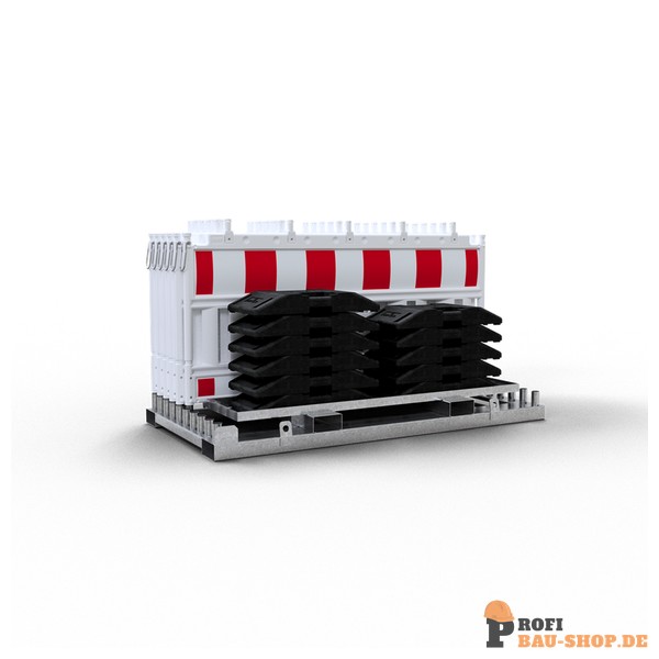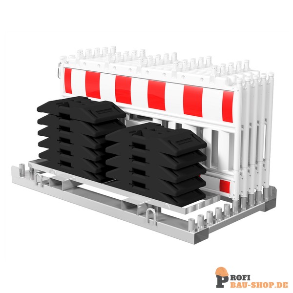 Absperrschrankengitter SET1 bestehend aus: 1 x Lager- und Transporttraverse für Absperrschrankengitter (Art.-Nr. 32000) 1 x Aufsatzteil für K1-Fußplatten (Art.-Nr. 32000-A) 10 x Absperrschrankengitter 11 x TL-Fußplatte nach K1, 30 kg (Art.-Nr. 31991) 2 x Zurrgurt 2-tlg. mit Ratsche (Art.-Nr. 50352-4)