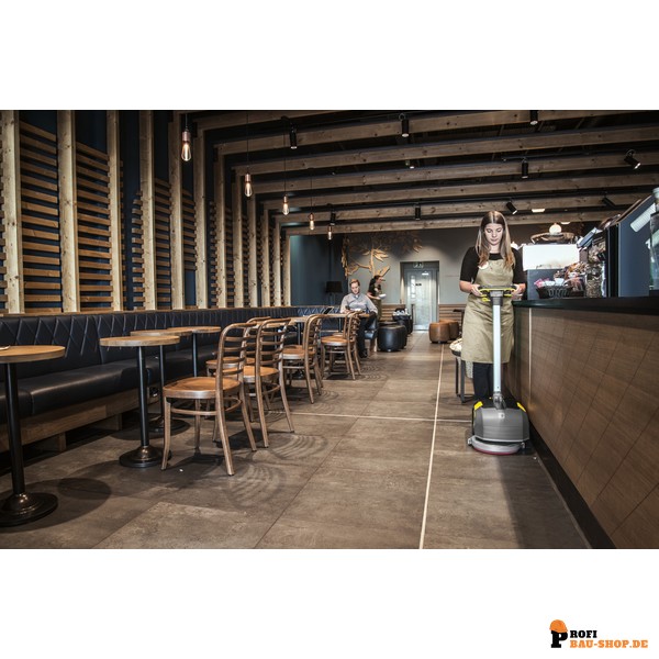 Entdecken Sie die Kärcher BD 30/4 C Bp Pack Li, eine revolutionäre, batteriebetriebene Scheuersaugmaschine, die speziell für die schnelle und effiziente Reinigung von Kleinflächen bis zu 300 m² konzipiert wurde. Mit ihrem ultrakompakten Design und einem geringen Gewicht von nur 20 kg bietet sie maximale Flexibilität und ist frei von störenden Kabeln, wodurch Stolperfallen der Vergangenheit angehören. Ob auf Natur- oder Kunststein, Epoxidharz, Linoleum oder PVC – dieses Gerät reinigt und saugt deutlich schneller und gründlicher als herkömmliche manuelle Methoden. Dank des umlaufenden Saugbalkens und der Möglichkeit, auch rückwärts zu reinigen, liefert die BD 30/4 C Bp Pack Li bei allen Manövern stets zuverlässige Ergebnisse. Das durchdachte Bedienkonzept mit farbcodierten Elementen und der schnelle Wechsel der leistungsfähigen Lithium-Ionen-Batterie runden das Profil dieses leistungsstarken Reinigungshelfers ab, der auch in verschiedenen Stockwerken ohne Aufzug problemlos eingesetzt werden kann.