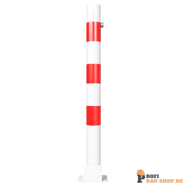Schake Absperrpfosten Stahlrohr Ø 76 x 2,6 mm umlegbar mit Profilzylinderschloss, für Dübelbefestigung mit Bodenplatte 100 x 150 mm, feuerverzinkt und weiß beschichtet mit drei rot reflektierenden Leuchtstreifen, mit 1 Öse