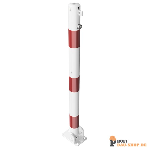 Schake Absperrpfosten Stahlrohr Ø 60 x 2,5 mm umlegbar für Vorhangschloss, für Dübelbefestigung mit Bodenplatte 100 x 150 mm, feuerverzinkt und weiß beschichtet mit drei rot reflektierenden Leuchtstreifen, mit 2 Ösen