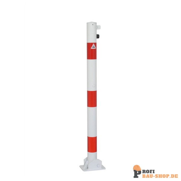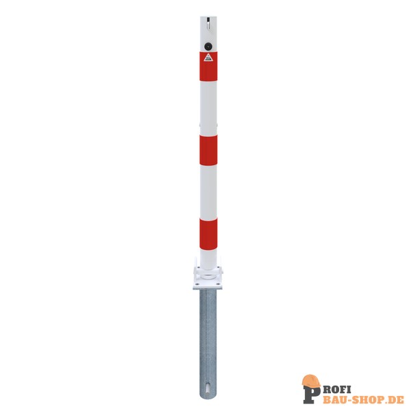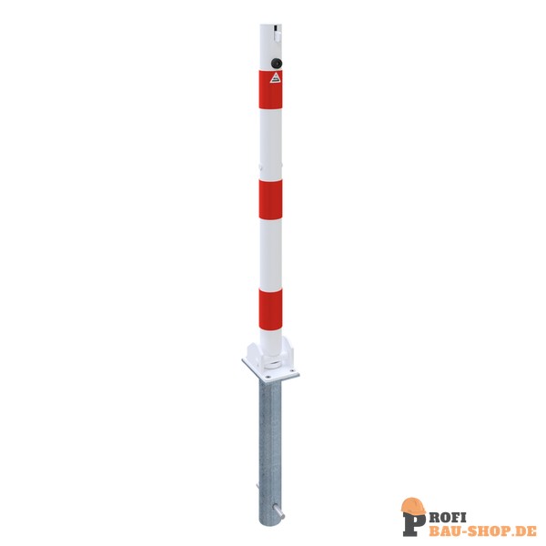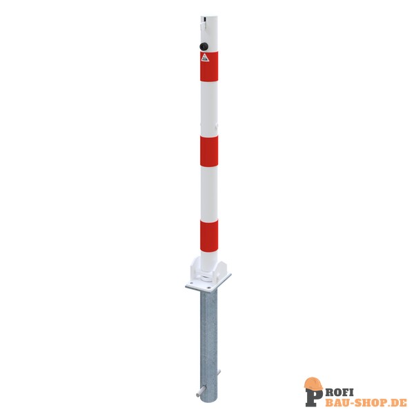 Schake Absperrpfosten Stahlrohr Ø 60 x 2,5 mm umlegbar für Vorhangschloss, zum Einbetonieren mit Bodenhülse Typ 470.60 ca. 400 mm Unterflur, feuerverzinkt und weiß beschichtet mit drei rot reflektierenden Leuchtstreifen, ohne Öse