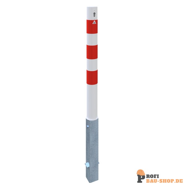 Schake Absperrpfosten Stahlrohr Ø 89 x 2,9 mm herausnehmbar mit Profilzylinder, feuerverzinkt und weiß beschichtet mit drei rot reflektierenden Leuchtstreifen