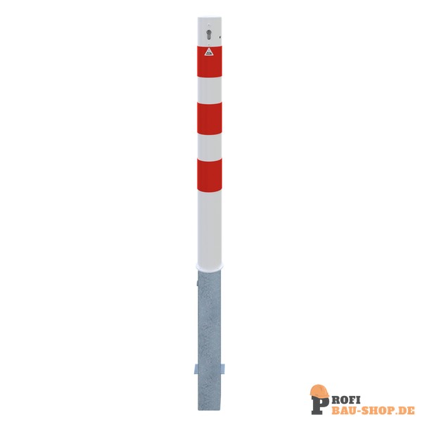 Technische Daten Absperrpfosten Stahlrohr Ø 89 x 2,9 mm herausnehmbar mit Profilzylinder, feuerverzinkt und weiß beschichtet mit drei rot reflektierenden Leuchtstreifen