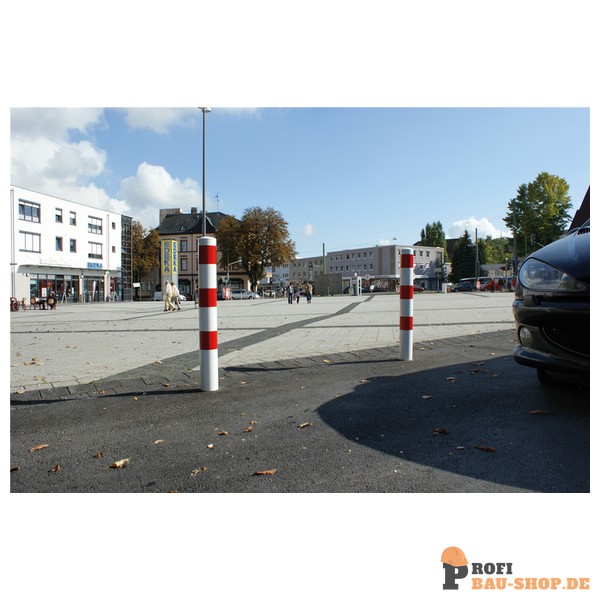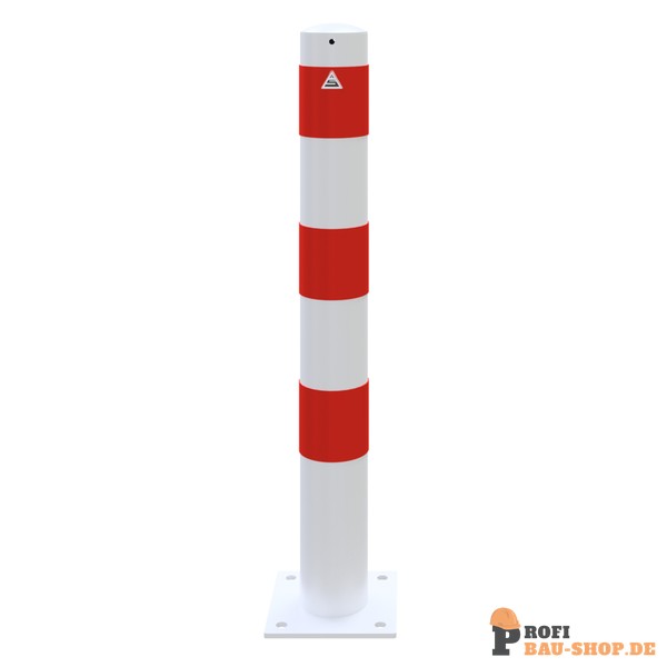 Schake Absperrpfosten Stahlrohr Ø 108 x 2,9 mm ortsfest für Dübelbefestigung, feuerverzinkt und weiß beschichtet mit drei rot reflektierenden Leuchtstreifen