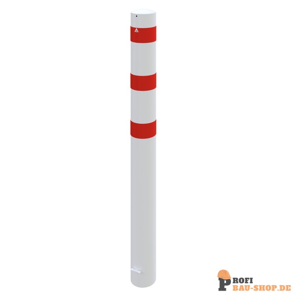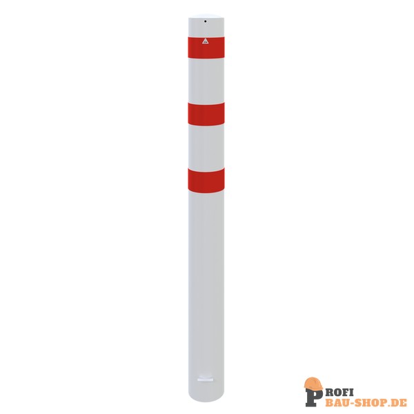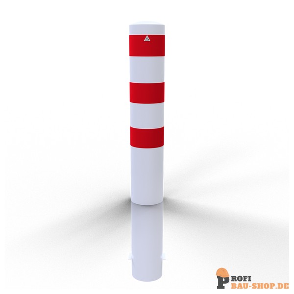 Schake Absperrpoller Stahlrohr Ø 193 x 3,6 mm ortsfest zum Einbetonieren, feuerverzinkt und weiß beschichtet mit drei rot reflektierenden Leuchtstreifen, Gesamtlänge: 2000 mm, mit aufgeschweißter Stahlkappe