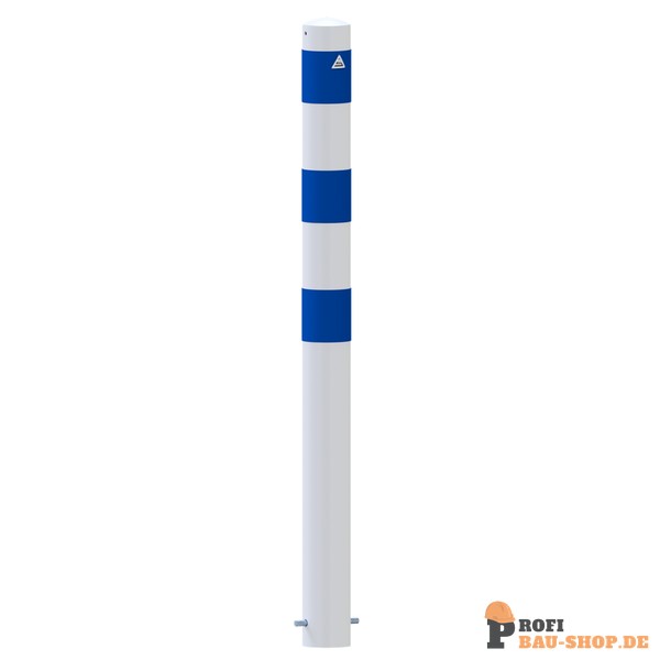 Schake Absperrpoller als E-Ladesäulenschutz, Ø 102 mm, feuerverzinkt & weiß pulverbeschichtet, 3 blaue RA1/A Reflektorstreifen, zum Einbetonieren, H 1200 mm