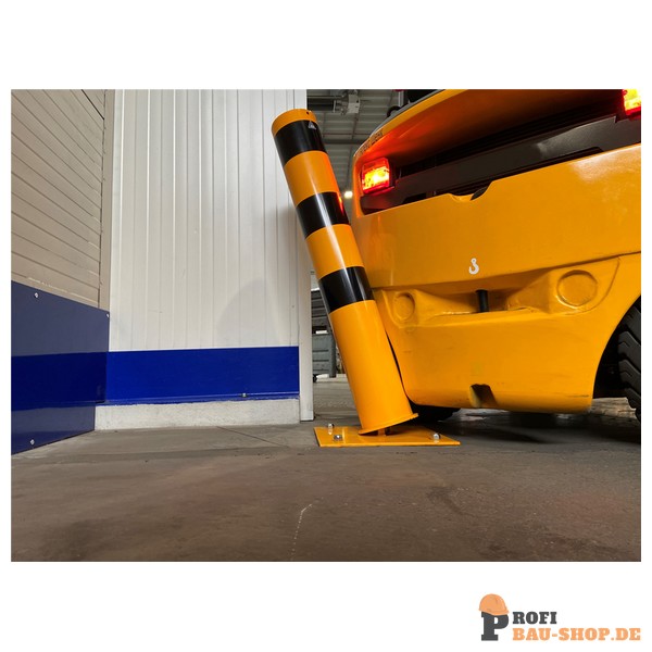 Stahlrohrpoller Ø 152 x 3,2 mm ortsfest, zum Aufdübeln mit aufgeschweißter Stahlkappe neigbar mit starker Zugfeder Dieser neigbare Stahlrohrpoller ist für hohe Anfahrbelastungen geeignet und stellt sich bei Entlastung automatisch in die Ausgangsposition zurück Das Signal bietet eine Hilfestellung bei engen Verkehrswegen mit dem Staplerverkehr, um vorbeugend keine Gegenstände zu beschädigen.