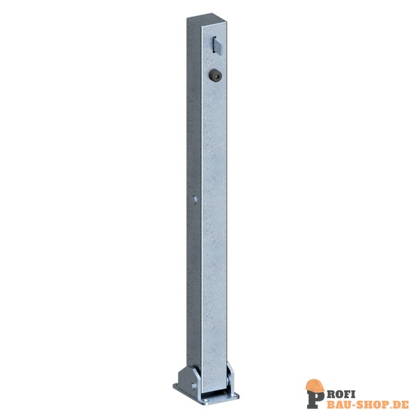 Technische Daten Absperrpfosten 70 x 70 mm umlegbar für Vorhangschloss, für Dübelbefestigung mit Bodenplatte 100 x 150 mm, feuerverzinkt, mit 2 Ösen