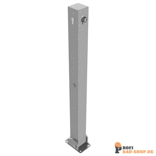 Schake Absperrpfosten 70 x 70 mm umlegbar mit Profilzylinderschloss, für Dübelbefestigung mit Bodenplatte 100 x 150 mm, feuerverzinkt, mit 2 Ösen