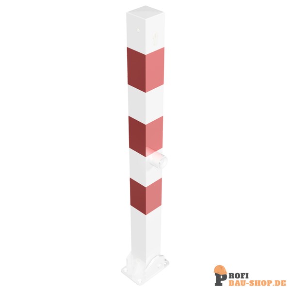 Schake Absperrpfosten 70 x 70 mm umlegbar mit Profilzylinderschloss und Dreikantverschluss, für Dübelbefestigung mit Bodenplatte 100 x 150 mm, feuerverzinkt und weiß beschichtet mit drei rot reflektierenden Leuchtstreifen, mit 2 Ösen
