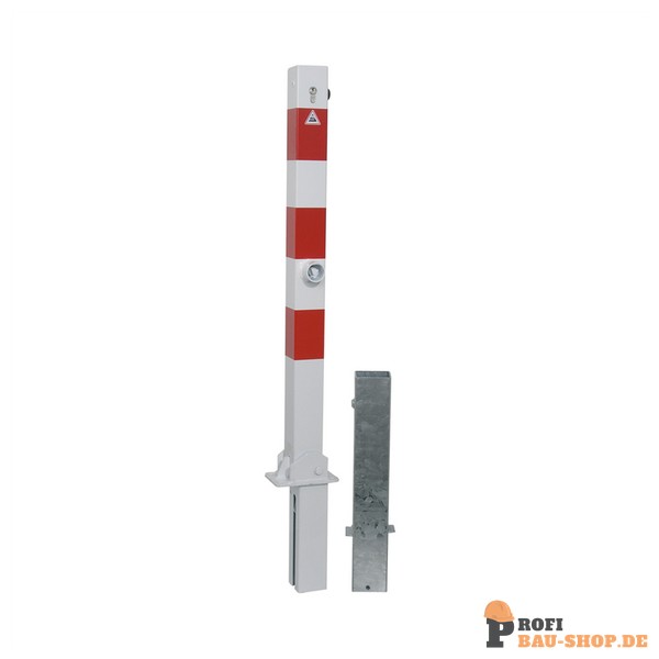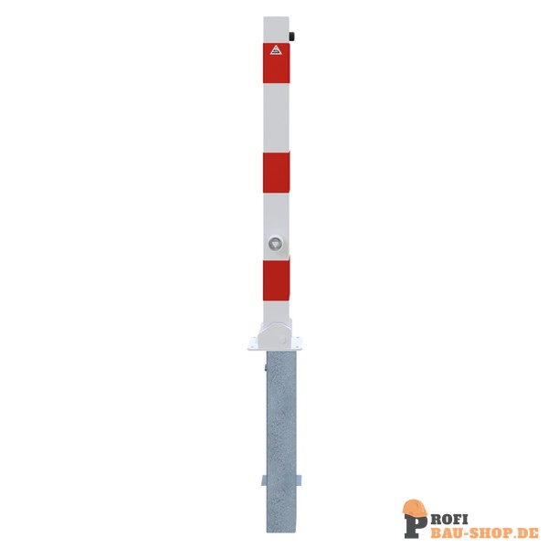 Technische Daten Absperrpfosten 70 x 70 mm umlegbar und herausnehmbar, mit Dreikantverschluss, feuerverzinkt und weiß beschichtet mit drei rot reflektierenden Leuchtstreifen, ohne Öse