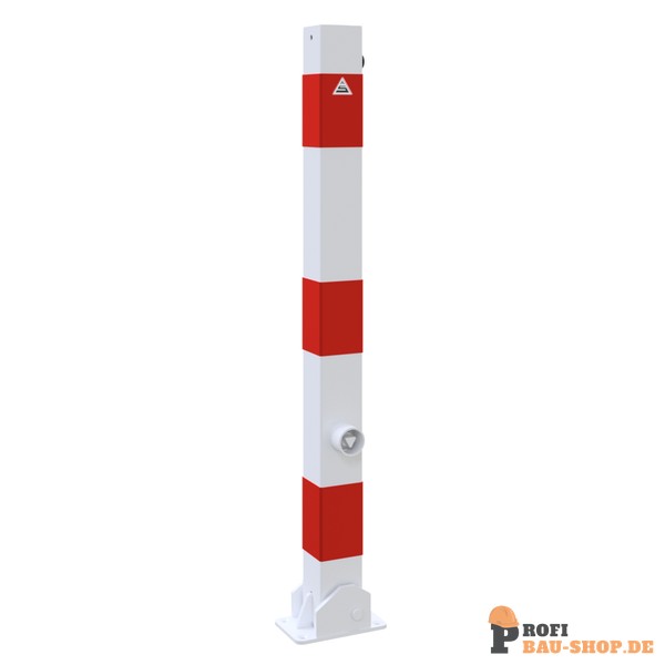 Schake Absperrpfosten 70 x 70 mm umlegbar mit Dreikantverschluss, für Dübelbefestigung mit Bodenplatte 100 x 150 mm, feuerverzinkt und weiß beschichtet mit drei rot reflektierenden Leuchtstreifen, ohne Öse