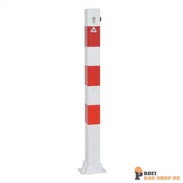 Absperrpfosten Vierkantrohr 70 x 70 mm mit aufgeschweißter Stahlkappe 900 mm Überflur umlegbar, mit Profilzylinderschloss drei Schlüssel, selbsteinrastende Verriegelung