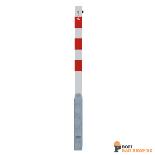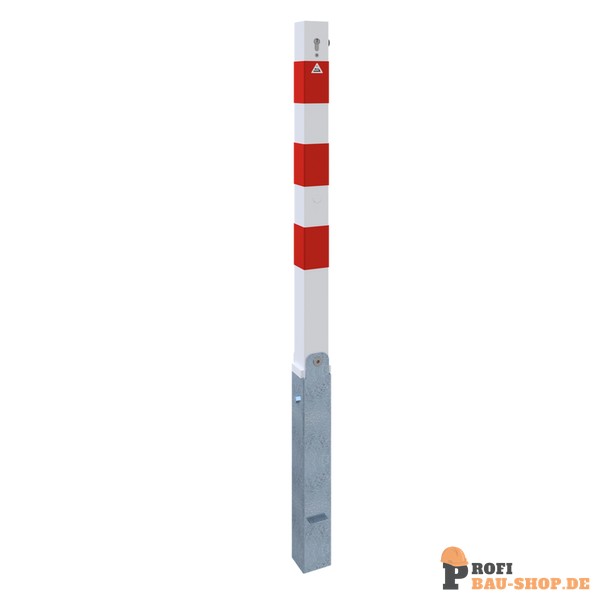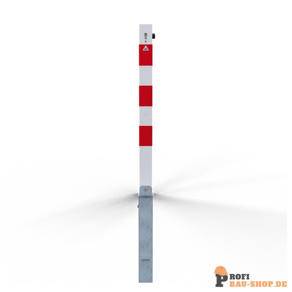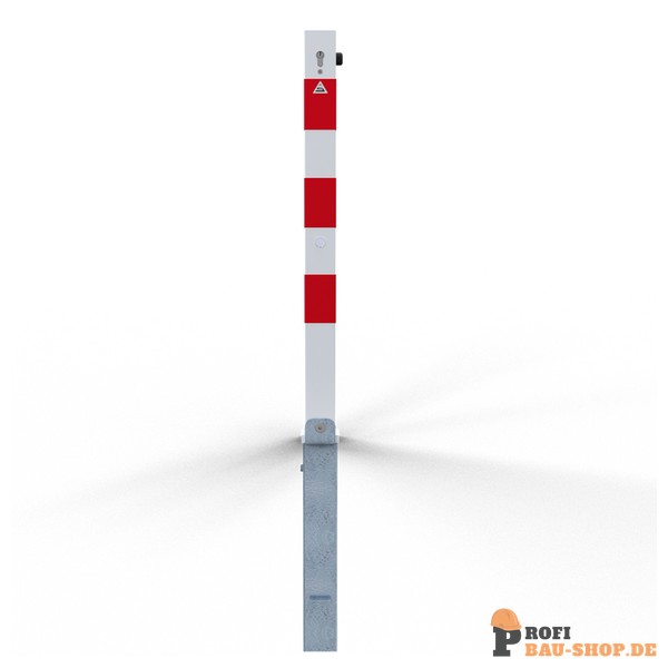 Schake Absperrpfosten 70 x 70 mm umlegbar mit Profilzylinderschloss mit Hebe- Kippmechanik, feuerverzinkt und weiß beschichtet mit drei rot reflektierenden Streifen