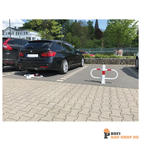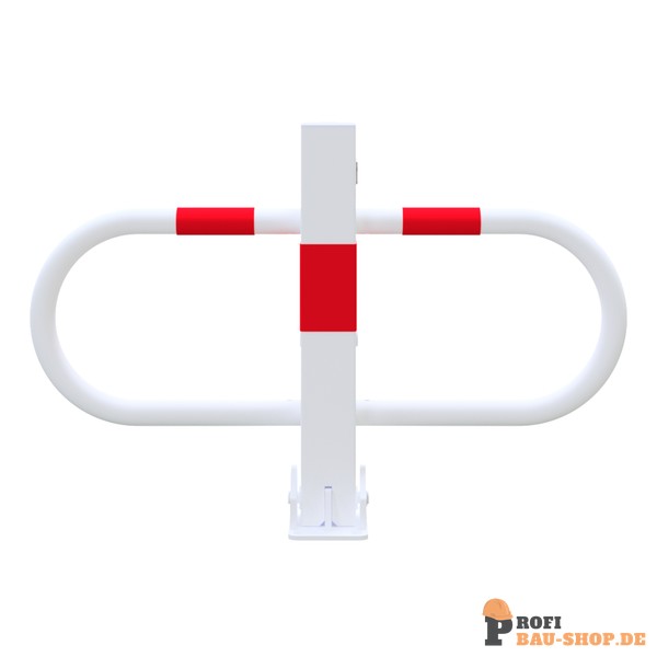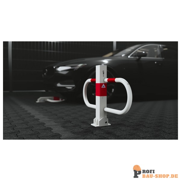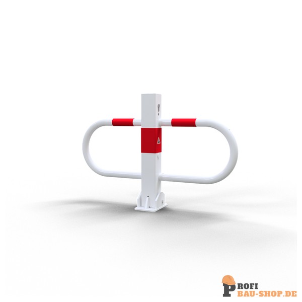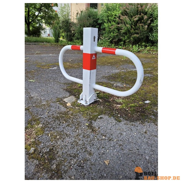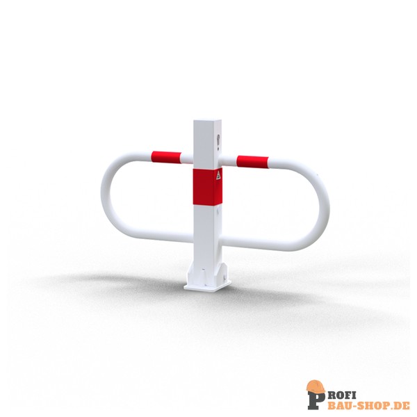 Schake Parkplatzsperre umlegbar mit Profilzylinderschloss, feuerverzinkt und weiß beschichtet mit rot reflektierenden Leuchtstreifen