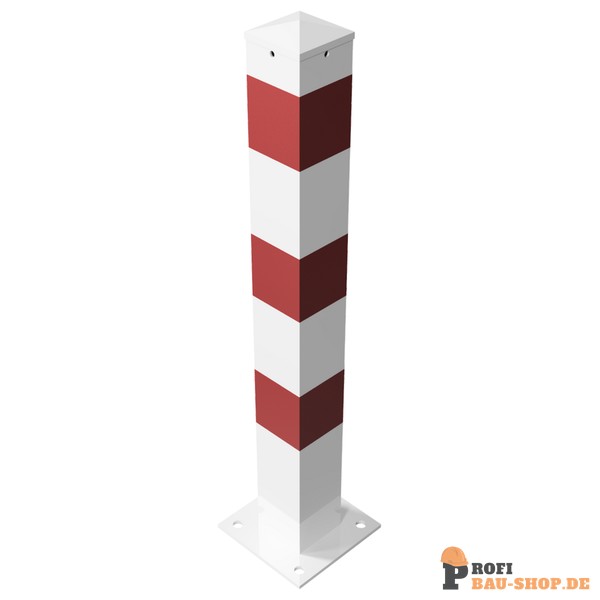 Technische Daten Absperrpfosten Stahlrohr 100 x 100 x 3 mm ortsfest für Dübelbefestigung, feuerverzinkt und weiß beschichtet mit drei rot reflektierenden Leuchtstreifen, mit 2 Ösen