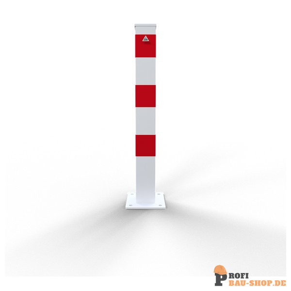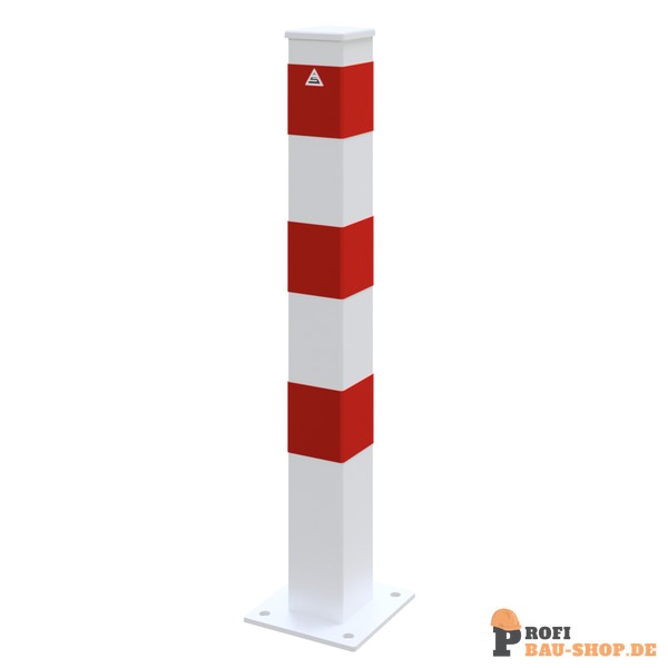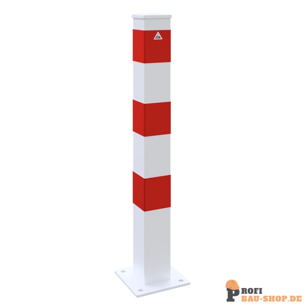 Technische Daten Absperrpfosten Stahlrohr 100 x 100 x 3 mm ortsfest für Dübelbefestigung, feuerverzinkt und weiß beschichtet mit drei rot reflektierenden Leuchtstreifen, ohne Öse