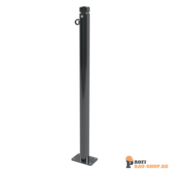 Absperr-Stilpfosten mit Ziernut aus Stahlrundrohr Ø 60 mm, ca. 950 mm Überflur, feuerverzinkt und anthrazitgrau DB 703 beschichtet.