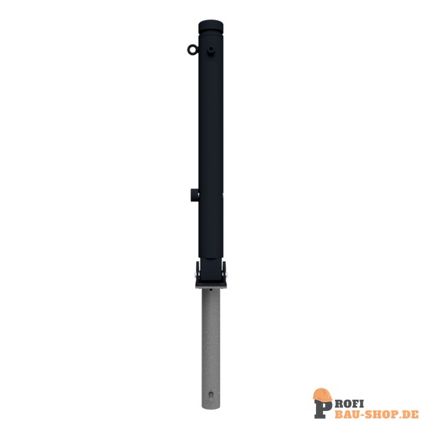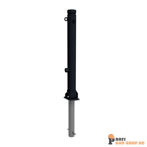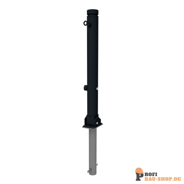 Schake Absperr-Stilpfosten Serie 482B Ø 82 mm, umlegbar, selbsteinrastende Verriegelung zum Einbetonieren, mit feuerverzinkter Bodenhülse Typ, mit Dreikantverschluss nach DIN 3223, mit 1 Öse