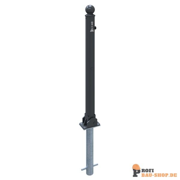 Schake Absperr-Stilpfosten Serie 474B Ø 76 mm, umlegbar, selbsteinrastende Verriegelung zum Einbetonieren, mit feuerverzinkter Bodenhülse Typ 470.60 ca. 400 mm unterflur, mit Prof
