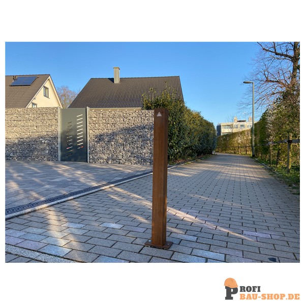 • Robuste Cortenstahl-Optik: Die Oberfläche ist roh und optisch vorgerostet, was dem Poller eine einzigartige, natürliche Patina und hohe Witterungsbeständigkeit verleiht.