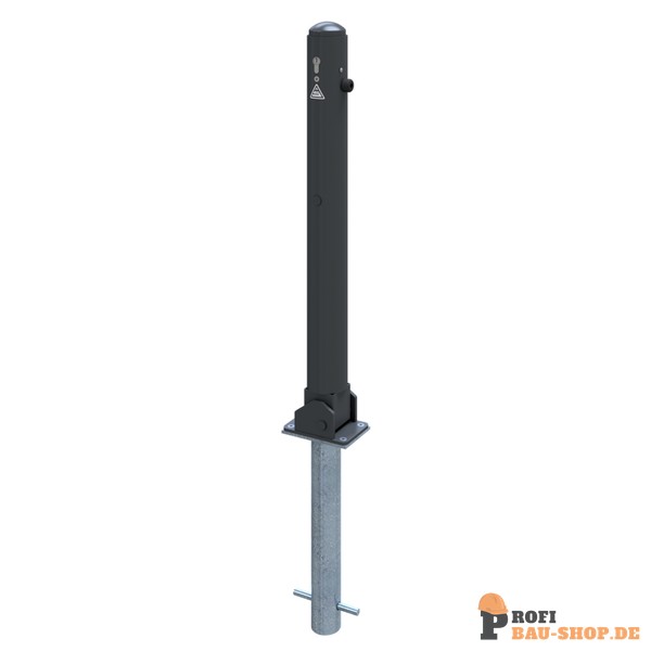 Schake Absperr-Stilpfosten Serie 480B Ø 82 mm, umlegbar, selbsteinrastende Verriegelung zum Einbetonieren, mit feuerverzinkter Bodenhülse Typ 47, mit Profilzylinderschloss und drei Schlüsseln, ohne Öse
