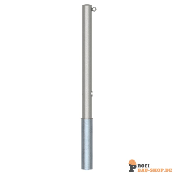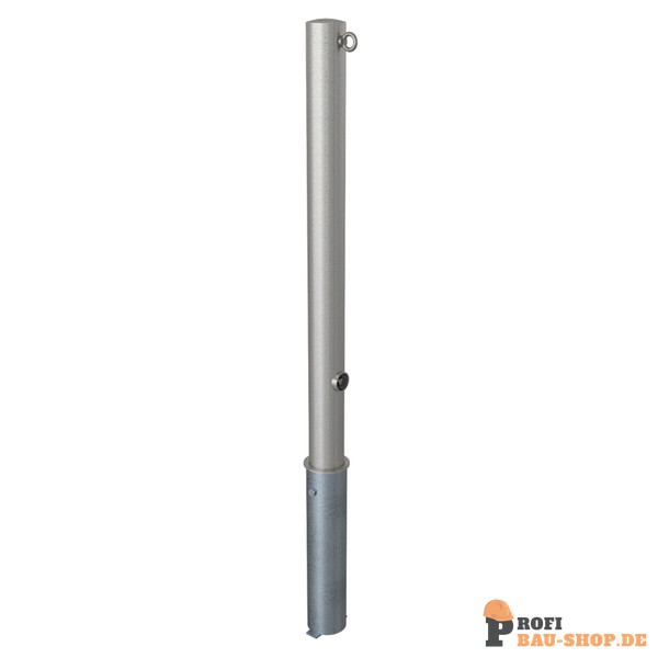 Schake Edelstahlpfosten Ø 76 mm ohne Ziernut, herausnehmbar, selbsteinrastende Verriegelung mit feuerverzinkter Bodenhülse Typ 476.40 ca. 40, mit Dreikantverschluss nach DIN 3223, mit 1 Öse
