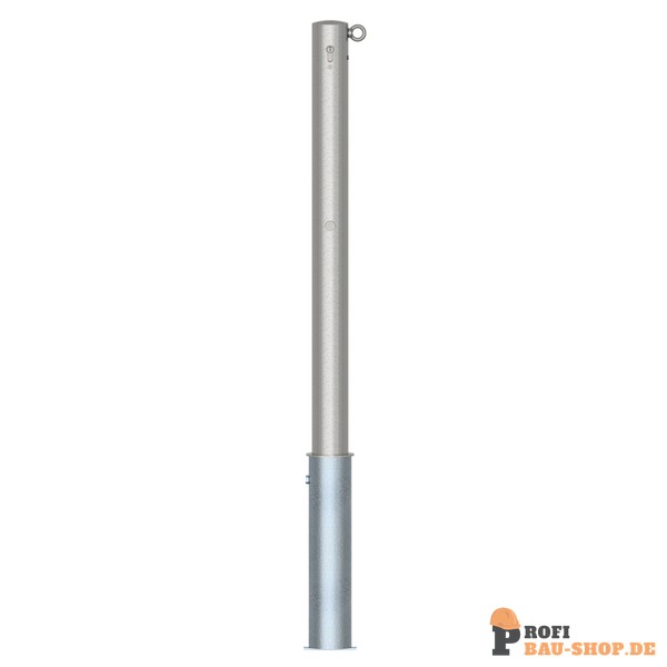 Schake Edelstahlpfosten Ø 76 mm ohne Ziernut, herausnehmbar, selbsteinrastende Verriegelung mit feuerverzinkter Bodenhülse Typ 476.40, mit Profilzylinderschloss und drei Schlüsseln, mit 1 Öse