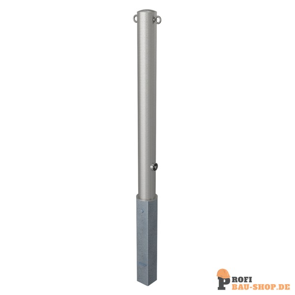 Schake Edelstahlpfosten Ø 89 mm, herausnehmbar, selbsteinrastende Verriegelung mit feuerverzinkter Bodenhülse Typ 470.10, mit Dreikantverschluss nach DIN 3223, mit 2 Ösen