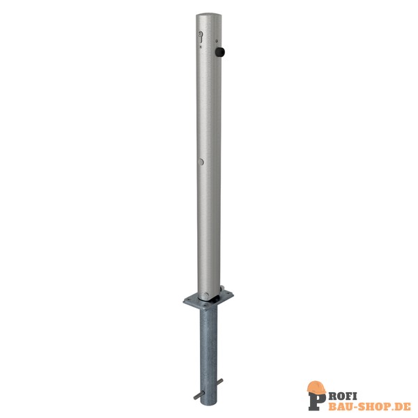 Schake Edelstahlpfosten Ø 76 mm ohne Ziernut, umlegbar, selbsteinrastende Verriegelung, mit feuerverzinkter Bodenhülse, Profilzylinderschloss und drei Schlüsseln
