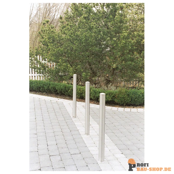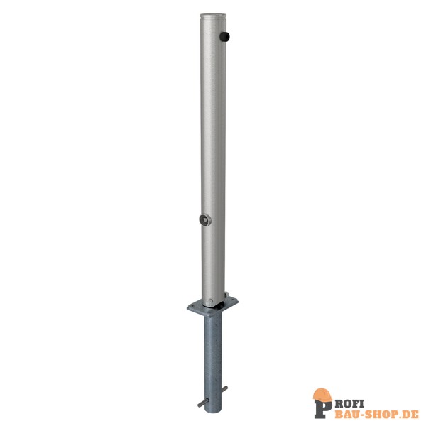 Schake Edelstahlpfosten Ø 76 mm mit Ziernut, umlegbar, selbsteinrastende Verriegelung zum Einbetonieren, mit feuerverzinkter Bodenhülse Typ, mit Dreikantverschluss nach DIN 3223,