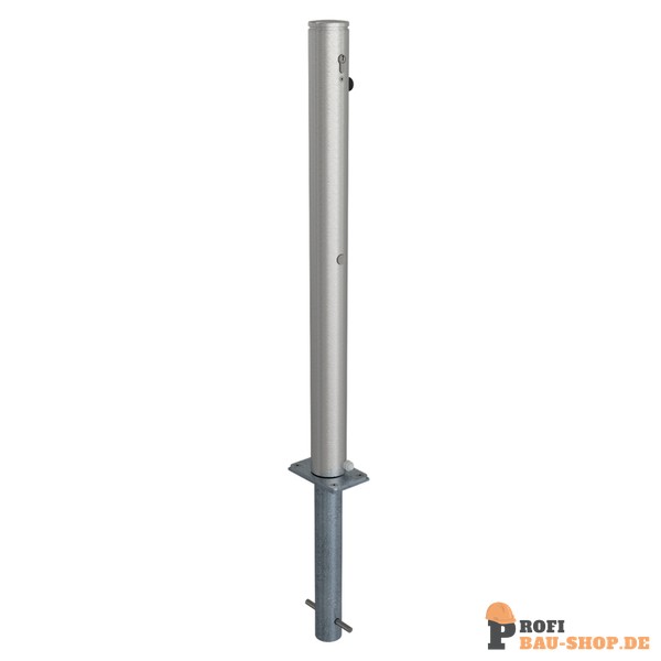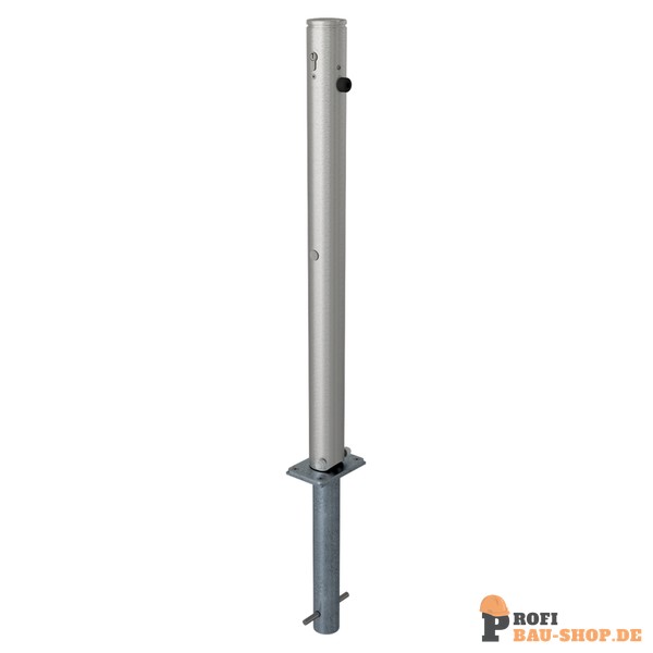 Schake Edelstahlpfosten Ø 76 mm mit Ziernut, umlegbar, selbsteinrastende Verriegelung zum Einbetonieren, inkl. feuerverzinkter Bodenhülse, Profilzylinderschloss & 3 Schlüsseln