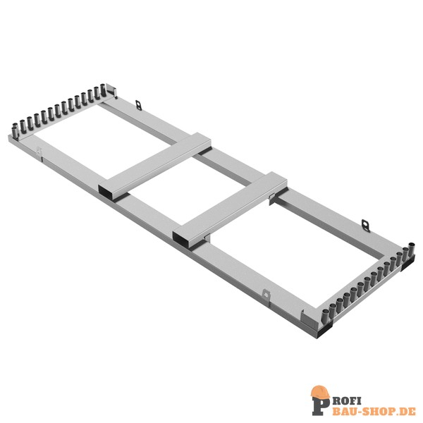 Robuste Schake Lager- und Transporttraverse für bis zu 29 Mobilzäune. Feuerverzinkt für Langlebigkeit und Korrosionsbeständigkeit. Ideal für Stapler- und Kranbetrieb.