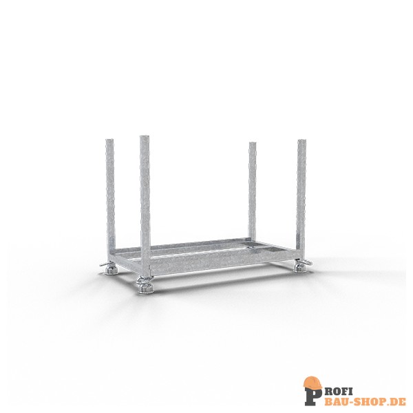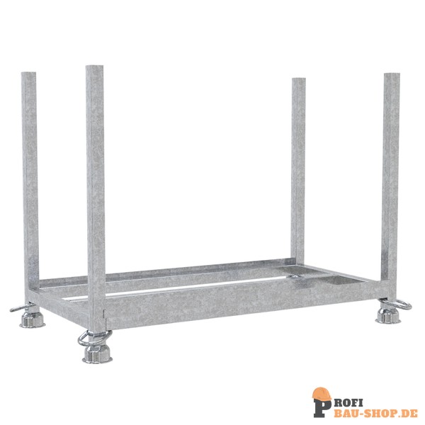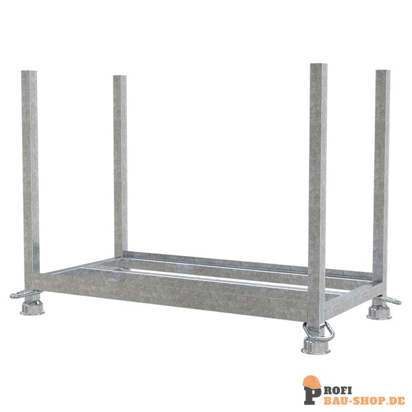 Stapelpalette für Bauzaunfüße für Lagerung und Transport von 25 Stk. Bauzaunfüßen 3F110 und 3F112 (5 Stk. Bauzaunfüße in der Breite und 5 Stk. Bauzaunfüße in der Höhe), Standrohre und Querholme sind aus 50 mm x 50 mm Vierkantrohr gefertigt inkl. Flachstahl zur Sicherung der unteren Lage Bauzaunfüße. Füllmaße: 1,30 m x 0,63 m x 0,90 m, mit zusätzlichem Mittelholm, sowohl für Stapler- und Hubwagenverkehr als auch für Kranbetrieb geeignet, durch die Kontur der Tulpenfüße lassen sich die Stapelpaletten standsicher stapeln, Zurrgurt für die Sicherung der Bauzaunfüße wird mitgeliefert. Ausführung: verzinkt
