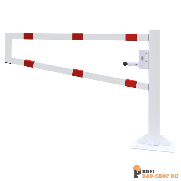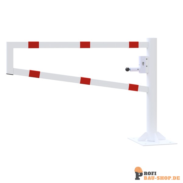 Schake Drehbare Wegesperre, für Dübelbefestigung, feuerverzinkt und weiß beschichtet mit rot reflektierenden Ringen, Gesamtbreite: 1500 mm, mit Profilzylinderschloss