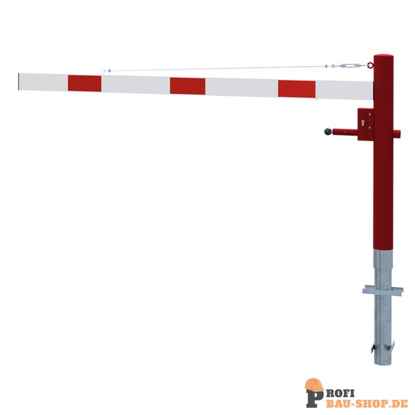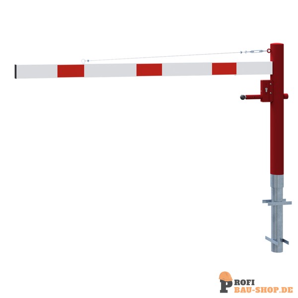 Schake Drehschranke mit Seilzugverstärkung, zum Einbetonieren, feuerverzinkt und weiß beschichtet mit rot reflektierenden Leuchtstreifen, Schrankenbaumlänge: 2000 mm, mit Profilzy