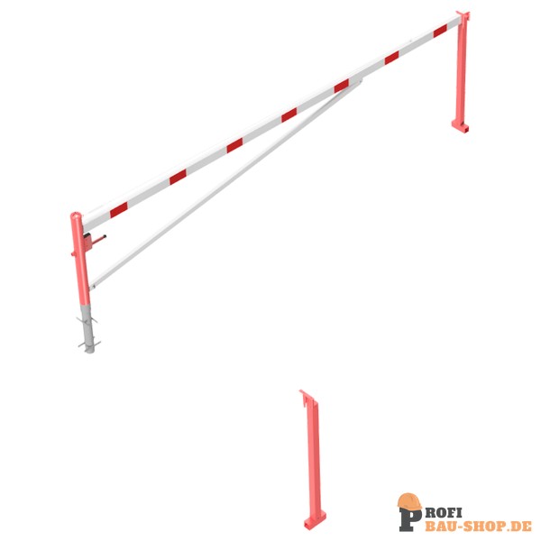 Schake Drehschranke mit Auflagepfosten und Seilzugverstärkung, zum Einbetonieren, feuerverzinkt und weiß beschichtet mit rot reflektierenden Leuchtstreifen, Schrankenbaumlänge: 50
