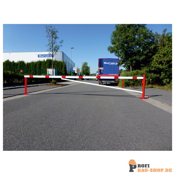 Schake Drehschranke mit Auflagepfosten und Seilzugverstärkung, zum Einbetonieren, feuerverzinkt und weiß beschichtet mit rot reflektierenden Leuchtstreifen, Schrankenbaumlänge: 5000 mm, mit Dreikantverschluss