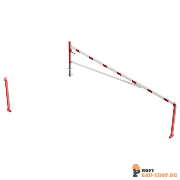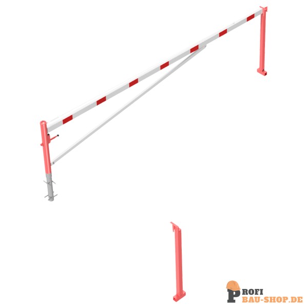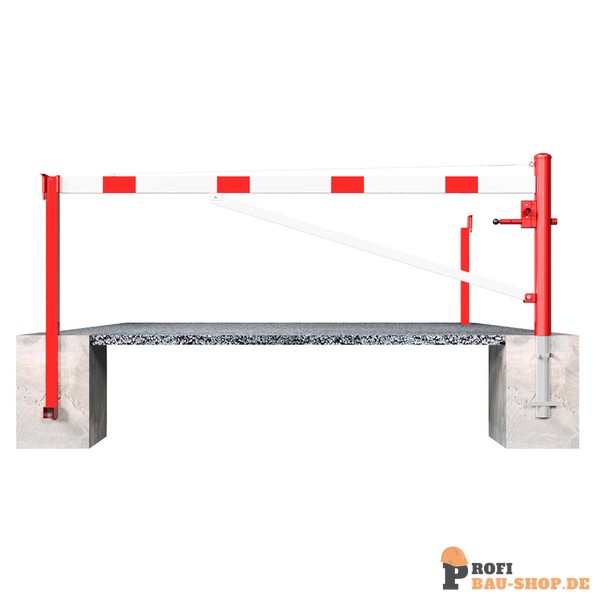 Schake Drehschranke mit Auflagepfosten und Seilzugverstärkung, zum Einbetonieren, feuerverzinkt und weiß beschichtet mit rot reflektierenden Leuchtstreifen, Schrankenbaumlänge: 50