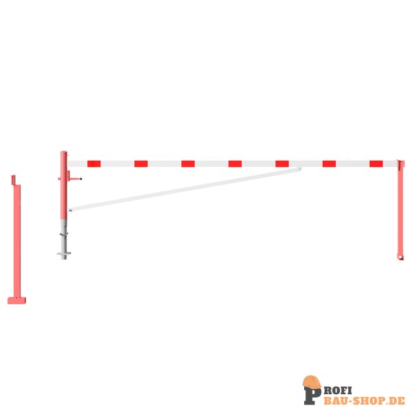 Drehschranke Horizontal schwenkbare Schranke mit Verstrebungsrohr und Seilzugverstärkung. Verriegelung am Drehpfosten geschlossen oder geöffnet, mit Bolzen, der in vier Stellungen verriegelt (alle 90°), vorgerichtet für Vorhangschloss oder mit Dreikantverschluss nach DIN 3223 bzw. Profilzylinderschloss, inkl. zwei Auflagepfosten Drehpfosten: Stahlrohr Ø 102 mm, feuerverzinkt und rot beschichtet Schrankenbaum: Aluminiumrohr 100 x 50 mm, weiß beschichtet mit rot refl. Streifen Auflagepfosten: Stahlrohr 70 x 70 mm, feuerverzinkt und rot beschichtet (2 Stück) Höhe: ca. 950 mm Überflur