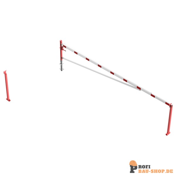 Drehschranke Horizontal schwenkbare Schranke mit Verstrebungsrohr und Seilzugverstärkung. Verriegelung am Drehpfosten geschlossen oder geöffnet, mit Bolzen, der in vier Stellungen verriegelt (alle 90°), vorgerichtet für Vorhangschloss oder mit Dreikantverschluss nach DIN 3223 bzw. Profilzylinderschloss, inkl. zwei Auflagepfosten Drehpfosten: Stahlrohr Ø 102 mm, feuerverzinkt und rot beschichtet Schrankenbaum: Aluminiumrohr 100 x 50 mm, weiß beschichtet mit rot refl. Streifen Auflagepfosten: Stahlrohr 70 x 70 mm, feuerverzinkt und rot beschichtet (2 Stück) Höhe: ca. 950 mm Überflur