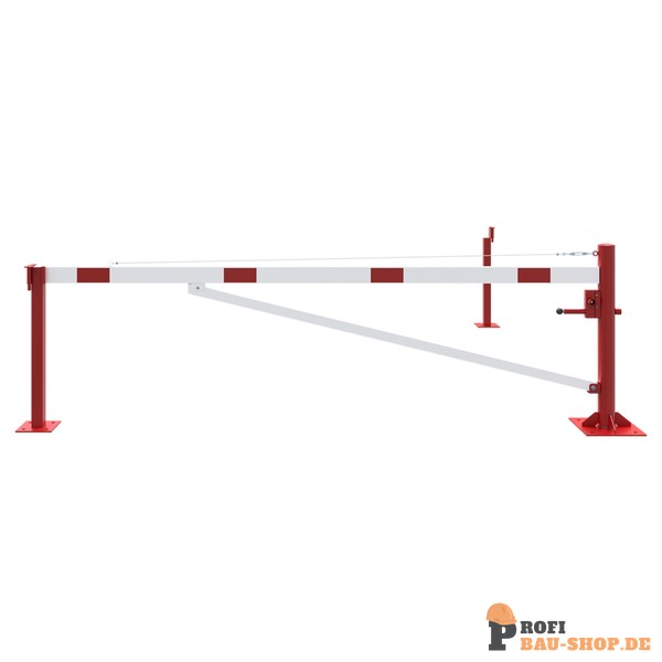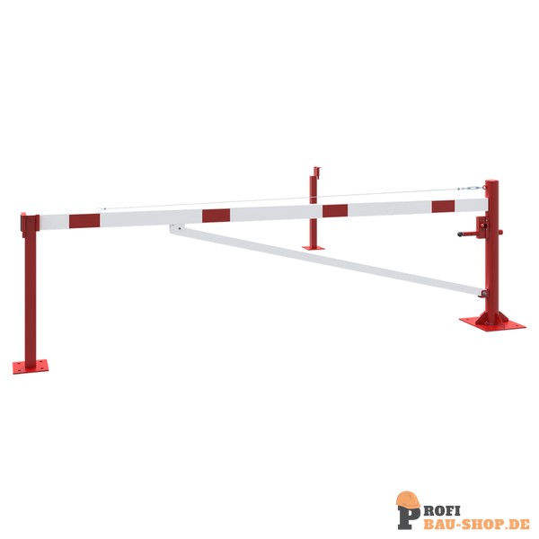 Schake Drehschranke mit Auflagepfosten und Seilzugverstärkung, für Dübelbefestigung, feuerverzinkt und rot beschichtet mit weiß reflektierenden Ringen, Schrankenbaumlänge: 3500 mm