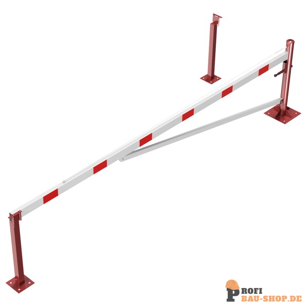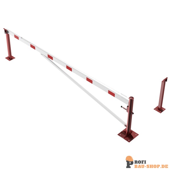 Schake Drehschranke mit Auflagepfosten und Seilzugverstärkung, für Dübelbefestigung, feuerverzinkt und rot beschichtet mit weiß reflektierenden Ringen, Schrankenbaumlänge: 4500 mm