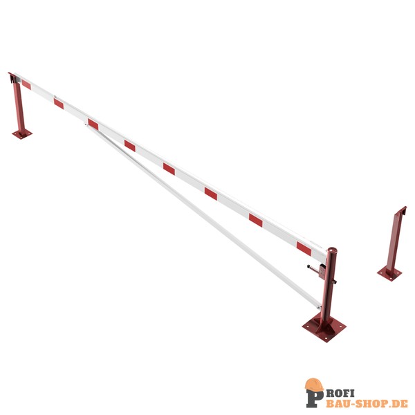 Schake Drehschranke mit Auflagepfosten und Seilzugverstärkung, für Dübelbefestigung, feuerverzinkt und rot beschichtet mit weiß reflektierenden Ringen, Schrankenbaumlänge: 5500 mm